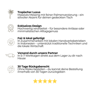 Bringe tropischen Luxus auf deinen Tisch! Unser massives Messingbesteck mit Palmenverzierung vereint Stil und Qualität – perfekt für ein stilvolles Ambiente.