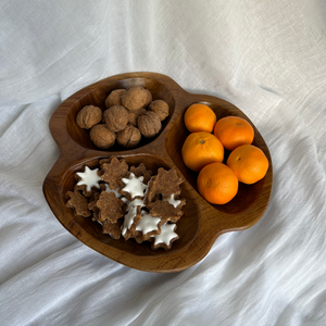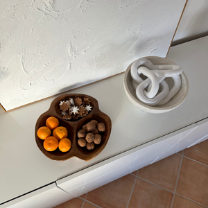 Die handgefertigte Nola Schale aus hochwertigem Teakholz besticht durch ihr außergewöhnliches Design mit drei separaten Fächern. Die natürlichen Maserungen des Holzes verleihen ihr einen einzigartigen Charme und machen sie zu einem stilvollen Blickfang in deinem Zuhause. Perfekt für die stilvolle Präsentation von Snacks, Nüssen oder kleinen Köstlichkeiten – ideal für gesellige Abende oder als dekoratives Element auf dem Tisch.